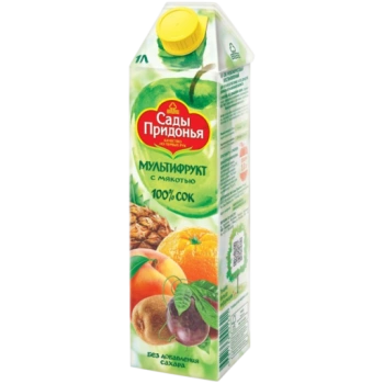 Сок Сады Придонья мультифруктовый 1л - это тропический микс спелых фруктов в одном пакете! Сладость натуральных соков апельсина, ананаса, яблока, персика и пюре из киви сбалансирована кислинкой маракуйи. Здесь нет подсластителей, консервантов, красителей, ароматизаторов и других искусственных добавок - только самые качественные плоды и ничего более! Продукт прекрасно подходит для питания детишек с 3-летнего возраста. Его яркий вкус будет уместен в экзотических соусах и горячих блюдах азиатской кухни.
